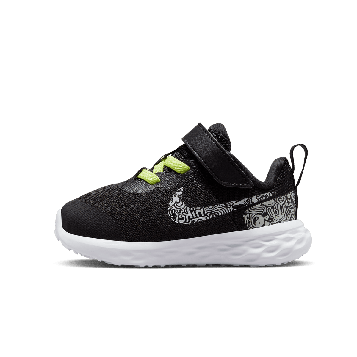 Sustine-i pasii in noi aventuri cu aceasta pereche de pantofi sport de la Nike!Nike acorda prioritate confortului in special pentru sportivii in crestere si in miscare. Fabricata cu cel putin 20% continut reciclat copiii pot alege aceasta pereche de pantofi Nike Revolution 6 de la joaca pe tot parcursul zilei pana la purtarea repetata.Cu sireturi elastice si o curea usoara copiii se pot simti confortabil si in siguranta atunci cand sunt incaltati.Arta si atletismAceasta editie speciala ii inspira pe copii sa deseneze si sa se exprime prin arta.Printul Nike este impresionant precum posterele lor preferate de colorat. Nike isi doreste sa ii vada pe cei mici creand propria lor arta!Confort racorosMaterialul textil este usor si respirabil astfel incat picioarele mici vor ramane mereu aerisite si racoroase.Sireturile elastice si cureaua cu scai fac aceasta pereche de pantofi sa fie usor de pus si de dat jos.Talpa din spuma creeaza o amortizare moale la fiecare pas.Talpa din cauciuc ofera tractiune pe mai multe categorii de drum.Stratul suplimentar de piele peste varful pantofului ofera protectie suplimentara pentru degete.SPECIFICATII:Sireturi elasticeCurea cu scaiTalpa intermediara din spumaTalpa exterioara din cauciucMaterial: 100% poliester reciclatCuloare: Negru / BlackCod produs: DV3183-001