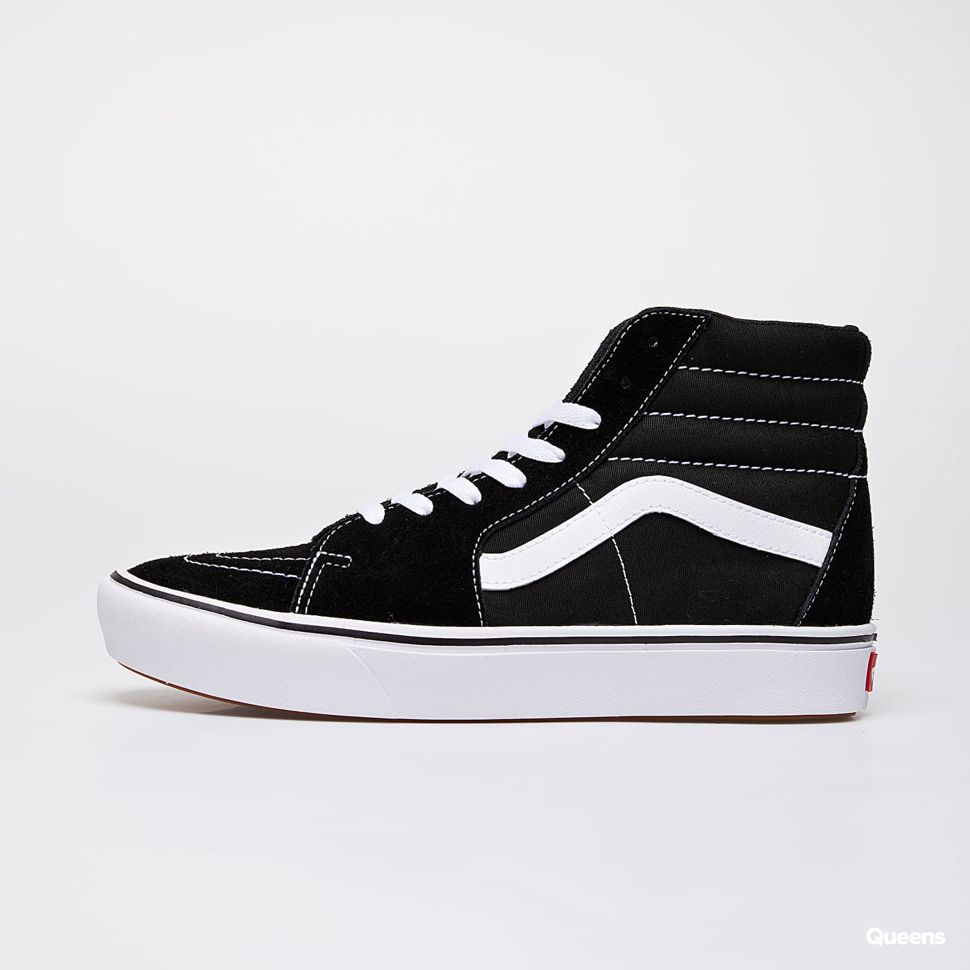 Kotníkové tenisky od značky Vans s názvem ComfyCush SK8-Hi (Classic) v černém provedení se hnědobílou podrážkou. – šněrování na tkaničky – gumová podešev – Vans sidestrip – logo na jazyku, boku a patě